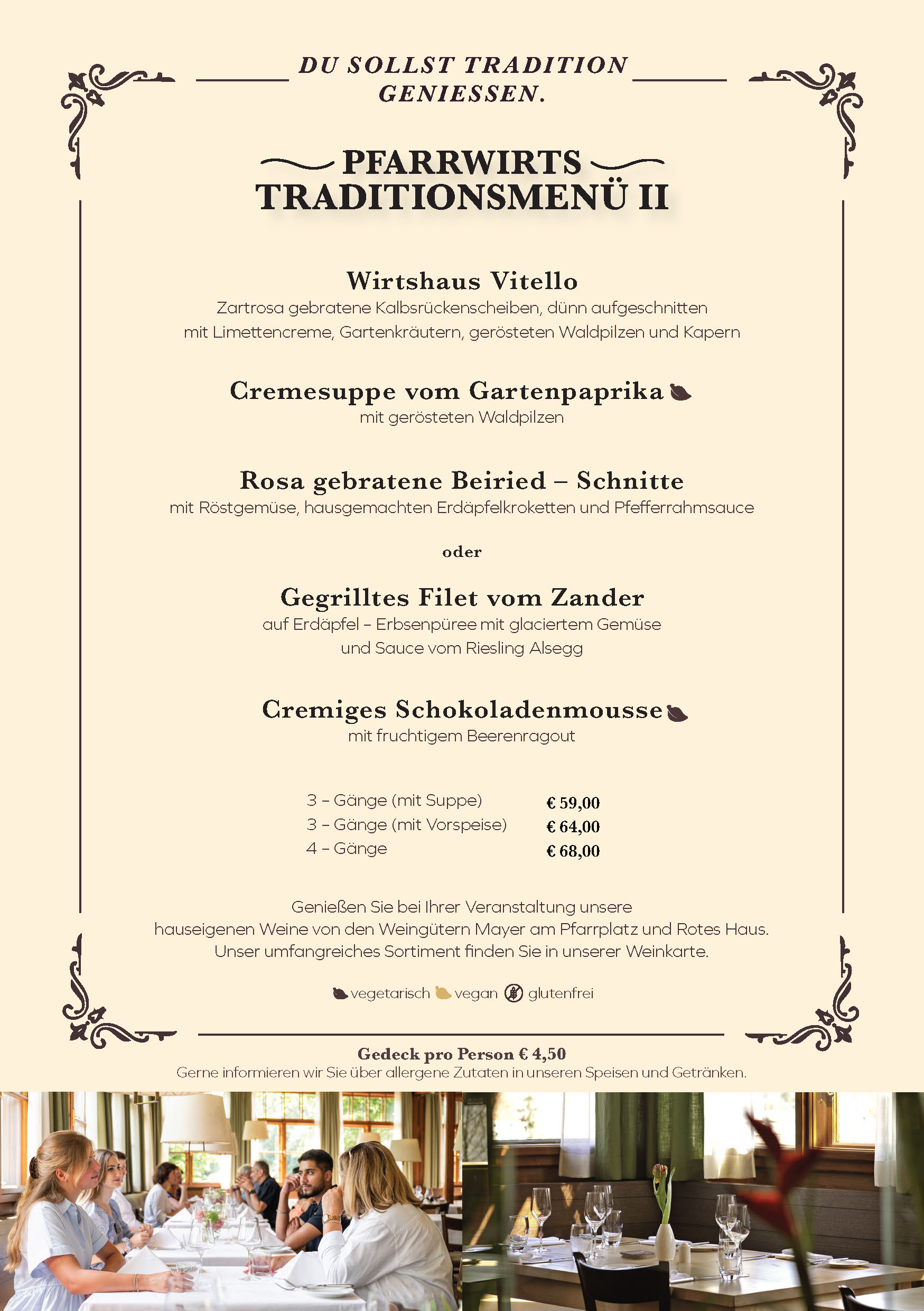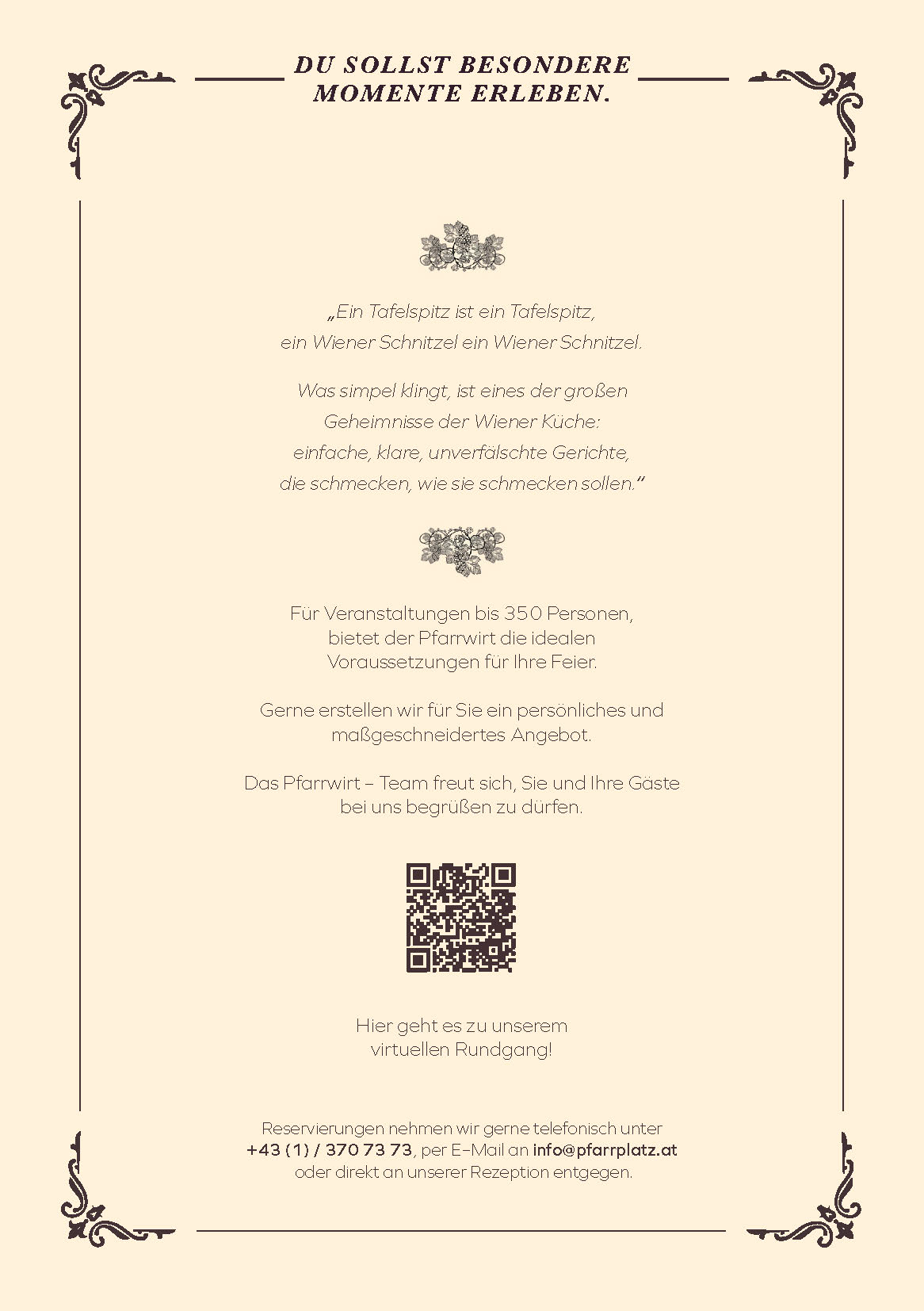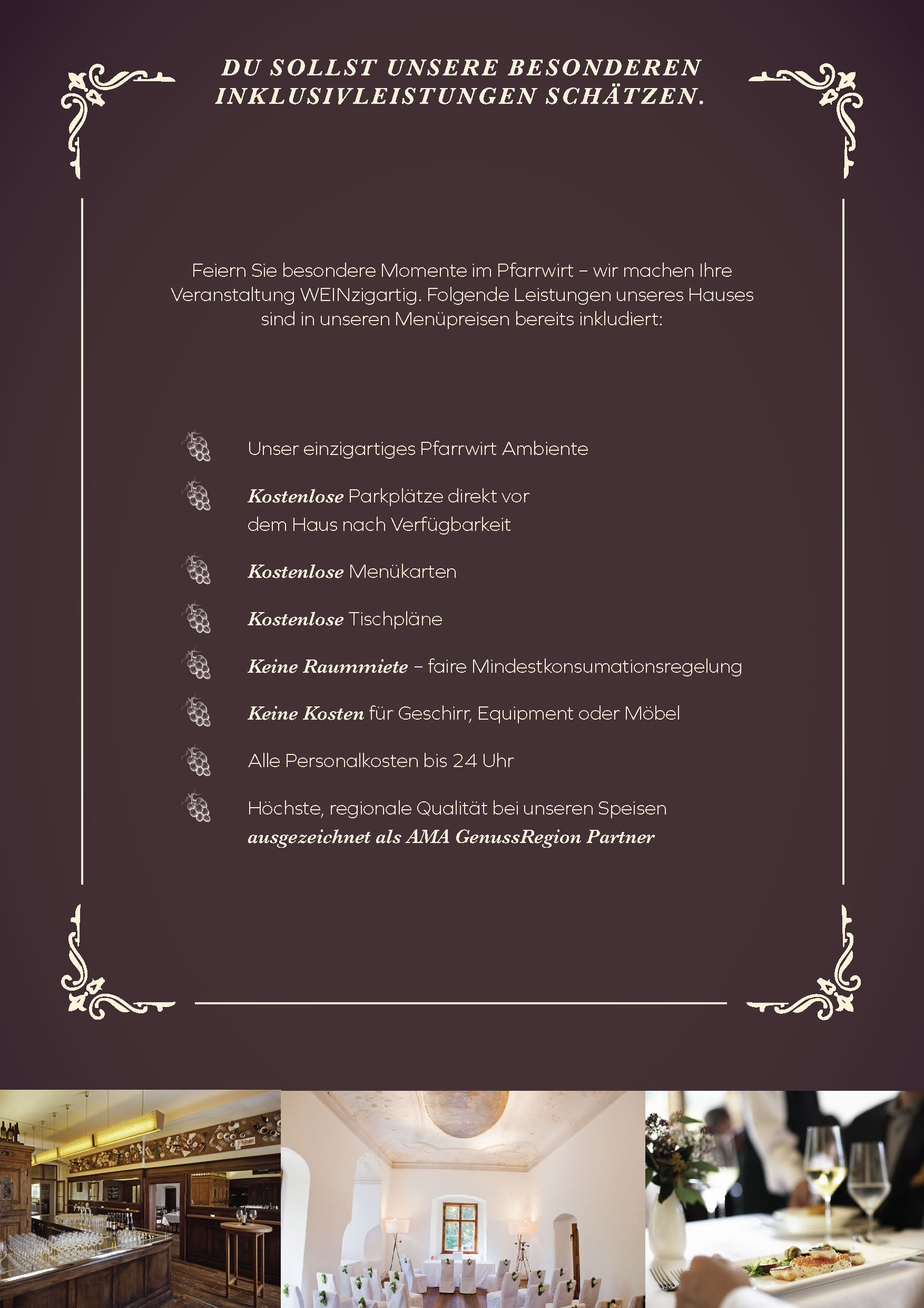 Verwöhnen Sie sich und Ihre Gäste im einzigartigen Ambiente unseres Pfarrwirts. Die zahlreichen Möglichkeiten unserer historischen Räume, die köstlichen Schmankerln in bewährter „Pfarrwirt – Qualität“ sowie unsere preisgekrönten Weine aus eigenem Anbau sind einige der Gründe, die Ihre Feier am Pfarrplatz zum unvergesslichen Erlebnis machen.